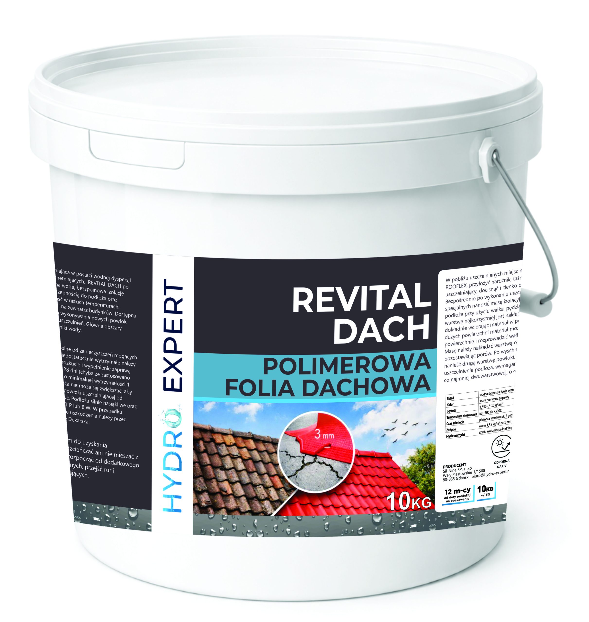 Revital Dach to jednoskładnikowa płynna membrana uszczelniająca, która pełni funkcję zarówno hydroizolacyjną, jak i dekoracyjną. Dzięki swojej elastyczności oraz odporności na warunki atmosferyczne, doskonale sprawdza się zarówno w tworzeniu nowych powłok dachowych, jak i renowacji istniejących pokryć.